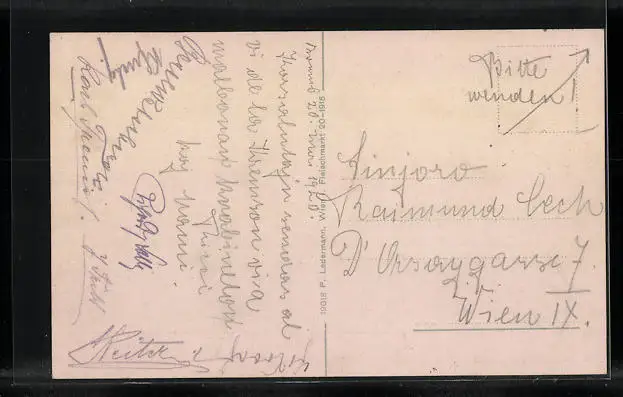 Personenbezogene Daten auf der Rückseite der Karte wurden durch blauen Textmarker unkenntlich gemacht. Die blauen Stellen sind auf die Vorderseite durchgeweicht und wirken sich negativ auf das Postkartenfoto aus
