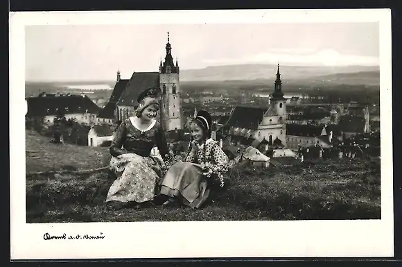 AK Krems a. d. Donau, Ortsansicht mit Trachtenträgerinnen