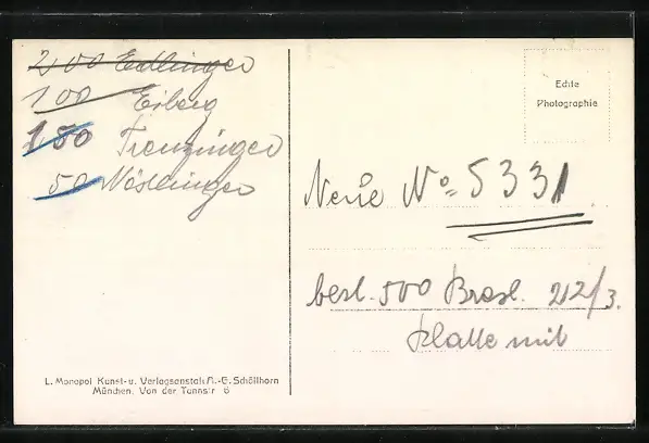 Personenbezogene Daten auf der Rückseite der Karte wurden durch blauen Textmarker unkenntlich gemacht. Die blauen Stellen sind auf die Vorderseite durchgeweicht und wirken sich negativ auf das Postkartenfoto aus