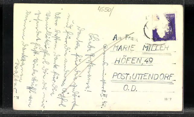 Personenbezogene Daten auf der Rückseite der Karte wurden durch blauen Textmarker unkenntlich gemacht. Die blauen Stellen sind auf die Vorderseite durchgeweicht und wirken sich negativ auf das Postkartenfoto aus