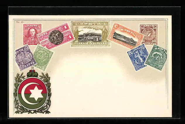 AK Kreta, Briefmarken und Wappen mit Ehrenkranz