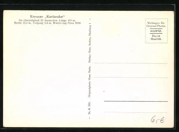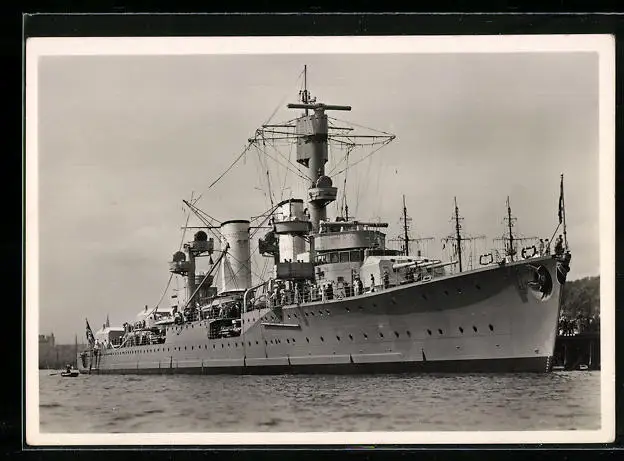 AK Kreuzer Karlsruhe im Hafen liegend