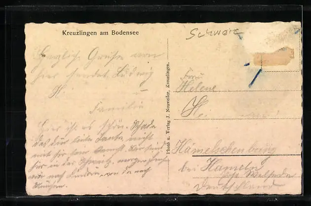 Personenbezogene Daten auf der Rückseite der Karte wurden durch blauen Textmarker unkenntlich gemacht. Die blauen Stellen sind auf die Vorderseite durchgeweicht und wirken sich negativ auf das Postkartenfoto aus