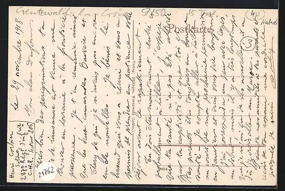 Personenbezogene Daten auf der Rückseite der Karte wurden durch blauen Textmarker unkenntlich gemacht. Die blauen Stellen sind auf die Vorderseite durchgeweicht und wirken sich negativ auf das Postkartenfoto aus
