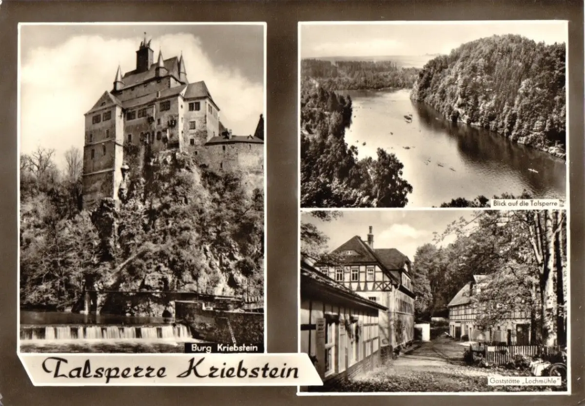 Ansichtskarte Kriebstein drei Abb. - Burg, Blick auf die Talsperre, Gaststätte "Lochmühle" Erhaltung I-II postalisch gelaufen, gestempelt: Mittweida 1, 15.6.71 Druckvermerk: 1971 Herstellungsland: DDR Verlag: Erhard Neubert, 901 Karl-Marx-Stadt - 41905N