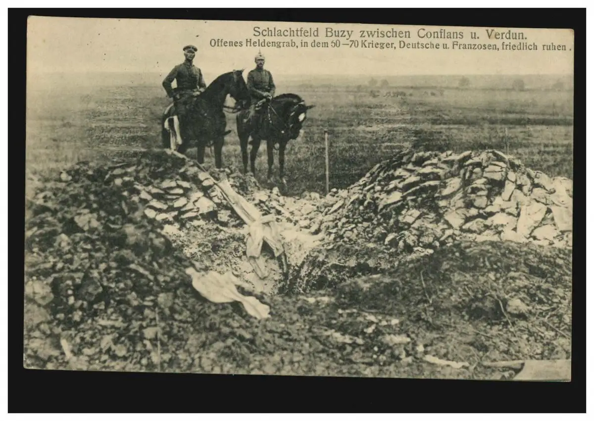 Offenes Massengrab, in den 50-70 Krieger, Deutsche und Franzosen, friedlich ruhen. Briefstempel 12. Kompanie Landw.-Inft.-Regt. Nr. 25
