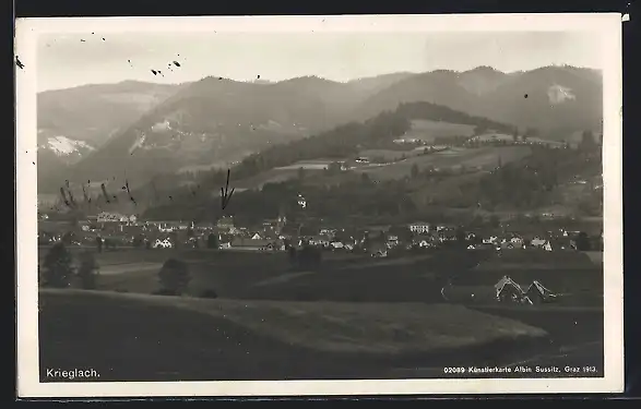 AK Krieglach, Totalansicht mit Bergen aus der Vogelschau