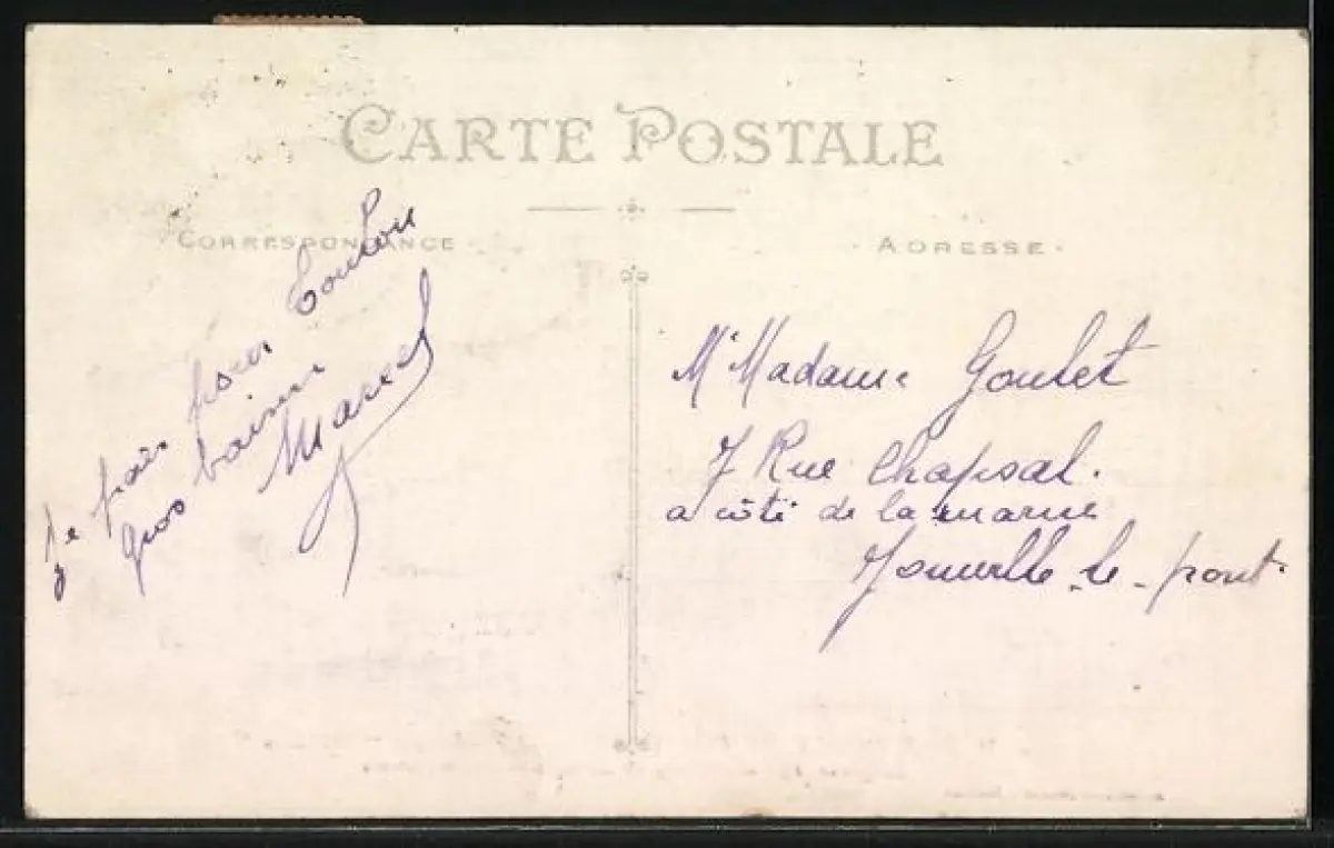 Personenbezogene Daten auf der Rückseite der Karte wurden durch blauen Textmarker unkenntlich gemacht. Die blauen Stellen sind auf die Vorderseite durchgeweicht und wirken sich negativ auf das Postkartenfoto aus
