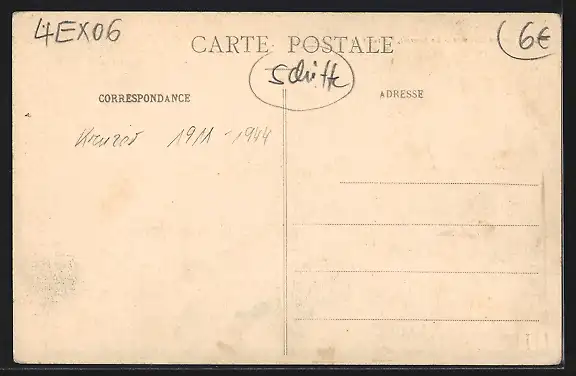 Personenbezogene Daten auf der Rückseite der Karte wurden durch blauen Textmarker unkenntlich gemacht. Die blauen Stellen sind auf die Vorderseite durchgeweicht und wirken sich negativ auf das Postkartenfoto aus