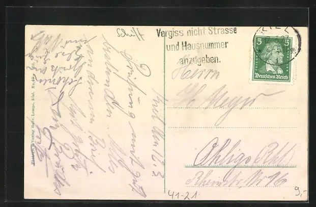 Personenbezogene Daten auf der Rückseite der Karte wurden durch blauen Textmarker unkenntlich gemacht. Die blauen Stellen sind auf die Vorderseite durchgeweicht und wirken sich negativ auf das Postkartenfoto aus