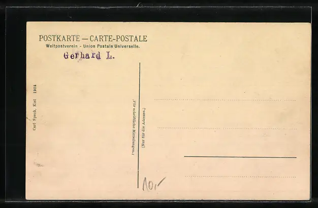 Personenbezogene Daten auf der Rückseite der Karte wurden durch blauen Textmarker unkenntlich gemacht. Die blauen Stellen sind auf die Vorderseite durchgeweicht und wirken sich negativ auf das Postkartenfoto aus