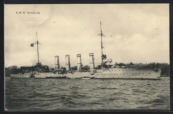 AK Kriegsschiff S. M. S. Strassburg vor einer Küste
