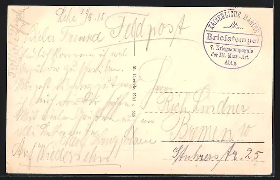 Personenbezogene Daten auf der Rückseite der Karte wurden durch blauen Textmarker unkenntlich gemacht. Die blauen Stellen sind auf die Vorderseite durchgeweicht und wirken sich negativ auf das Postkartenfoto aus