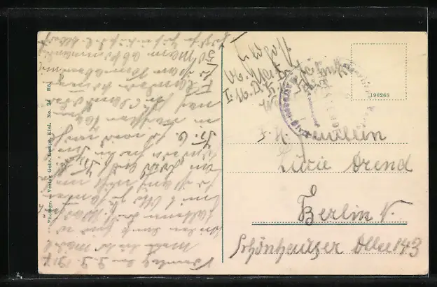 Personenbezogene Daten auf der Rückseite der Karte wurden durch blauen Textmarker unkenntlich gemacht. Die blauen Stellen sind auf die Vorderseite durchgeweicht und wirken sich negativ auf das Postkartenfoto aus