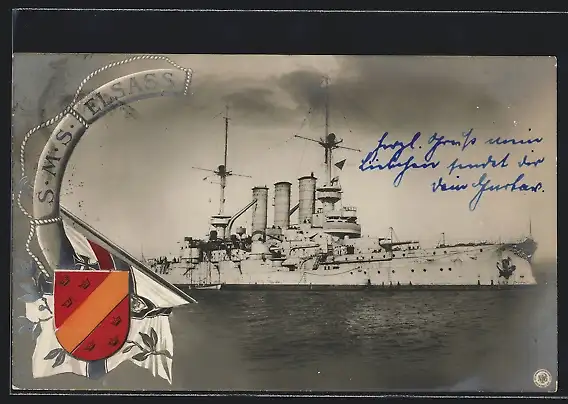 AK Kriegsschiff S.M.S. Elsass mit einem kleinen Beiboot auf dem Wasser treibend, Reichskriegsflagge