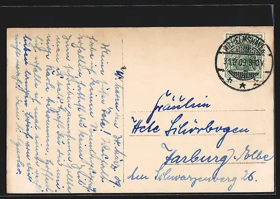 Personenbezogene Daten auf der Rückseite der Karte wurden durch blauen Textmarker unkenntlich gemacht. Die blauen Stellen sind auf die Vorderseite durchgeweicht und wirken sich negativ auf das Postkartenfoto aus
