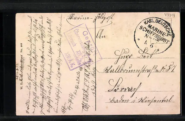 Personenbezogene Daten auf der Rückseite der Karte wurden durch blauen Textmarker unkenntlich gemacht. Die blauen Stellen sind auf die Vorderseite durchgeweicht und wirken sich negativ auf das Postkartenfoto aus