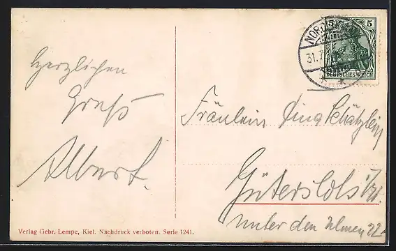 Personenbezogene Daten auf der Rückseite der Karte wurden durch blauen Textmarker unkenntlich gemacht. Die blauen Stellen sind auf die Vorderseite durchgeweicht und wirken sich negativ auf das Postkartenfoto aus