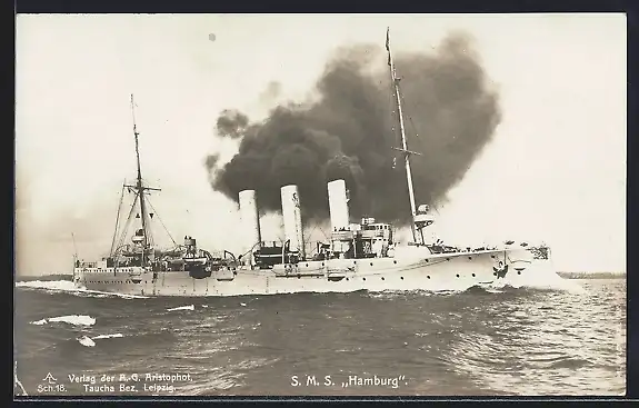 AK Kriegsschiff SMS Hamburg fährt unter Volldampf entlang der Küste