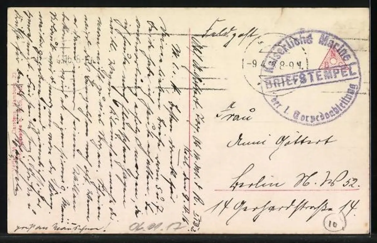 Personenbezogene Daten auf der Rückseite der Karte wurden durch blauen Textmarker unkenntlich gemacht. Die blauen Stellen sind auf die Vorderseite durchgeweicht und wirken sich negativ auf das Postkartenfoto aus
