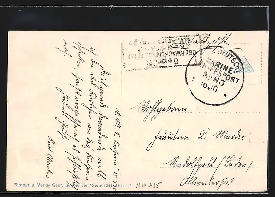 Personenbezogene Daten auf der Rückseite der Karte wurden durch blauen Textmarker unkenntlich gemacht. Die blauen Stellen sind auf die Vorderseite durchgeweicht und wirken sich negativ auf das Postkartenfoto aus