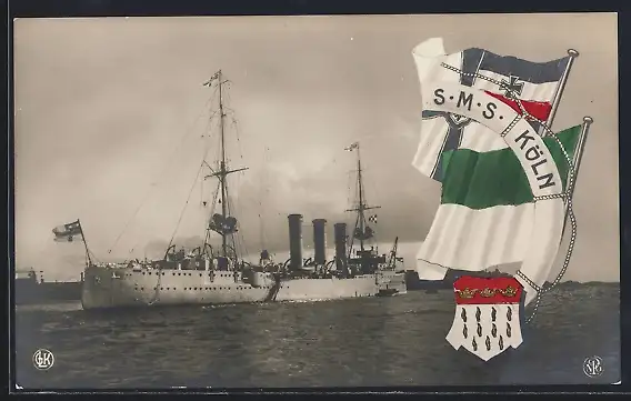 AK Kriegsschiff S.M.S. Köln nahe einer Ortschaft vor Anker liegend, Reichskriegsflagge