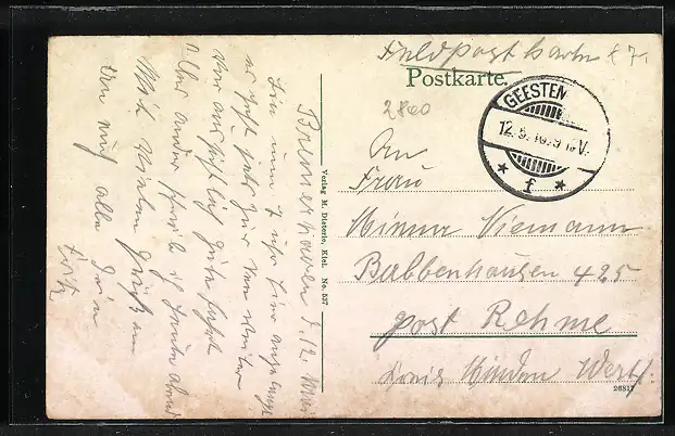 Personenbezogene Daten auf der Rückseite der Karte wurden durch blauen Textmarker unkenntlich gemacht. Die blauen Stellen sind auf die Vorderseite durchgeweicht und wirken sich negativ auf das Postkartenfoto aus
