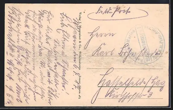 Personenbezogene Daten auf der Rückseite der Karte wurden durch blauen Textmarker unkenntlich gemacht. Die blauen Stellen sind auf die Vorderseite durchgeweicht und wirken sich negativ auf das Postkartenfoto aus