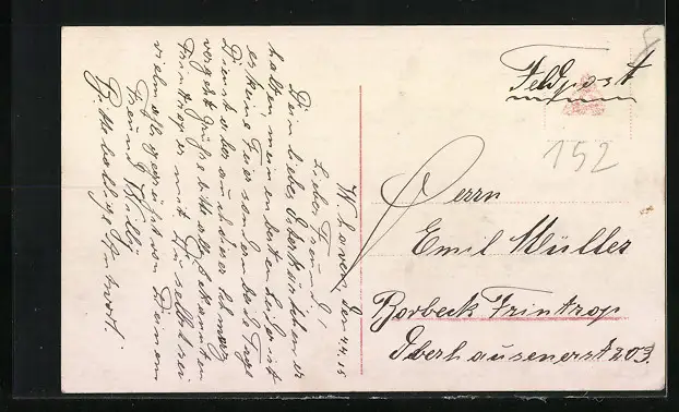 Personenbezogene Daten auf der Rückseite der Karte wurden durch blauen Textmarker unkenntlich gemacht. Die blauen Stellen sind auf die Vorderseite durchgeweicht und wirken sich negativ auf das Postkartenfoto aus