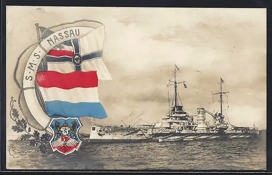 AK Kriegsschiff S.M.S. Nassau, Reichskriegsflagge und Wappen
