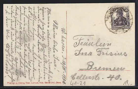 Personenbezogene Daten auf der Rückseite der Karte wurden durch blauen Textmarker unkenntlich gemacht. Die blauen Stellen sind auf die Vorderseite durchgeweicht und wirken sich negativ auf das Postkartenfoto aus