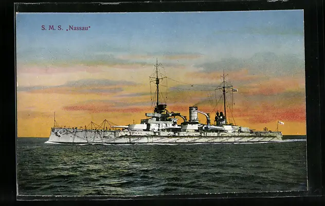 AK Kriegsschiff SMS Nassau im Abendlicht