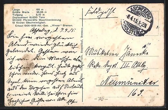 alte Ansichtskarte, gelaufen 1915, Bugspuren unten li. und oben re., Eckknick re. oben, guter Zustand