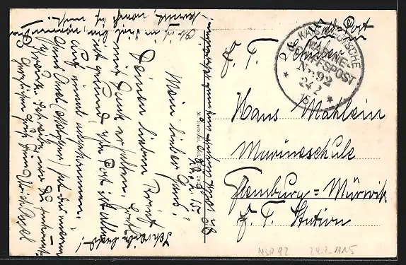 Personenbezogene Daten auf der Rückseite der Karte wurden durch blauen Textmarker unkenntlich gemacht. Die blauen Stellen sind auf die Vorderseite durchgeweicht und wirken sich negativ auf das Postkartenfoto aus