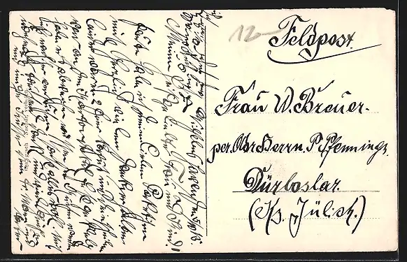 Personenbezogene Daten auf der Rückseite der Karte wurden durch blauen Textmarker unkenntlich gemacht. Die blauen Stellen sind auf die Vorderseite durchgeweicht und wirken sich negativ auf das Postkartenfoto aus