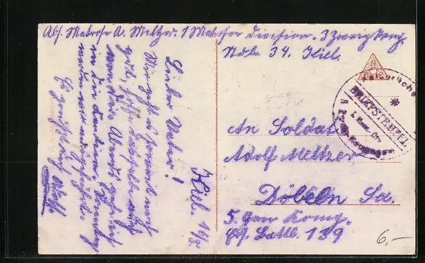 Personenbezogene Daten auf der Rückseite der Karte wurden durch blauen Textmarker unkenntlich gemacht. Die blauen Stellen sind auf die Vorderseite durchgeweicht und wirken sich negativ auf das Postkartenfoto aus