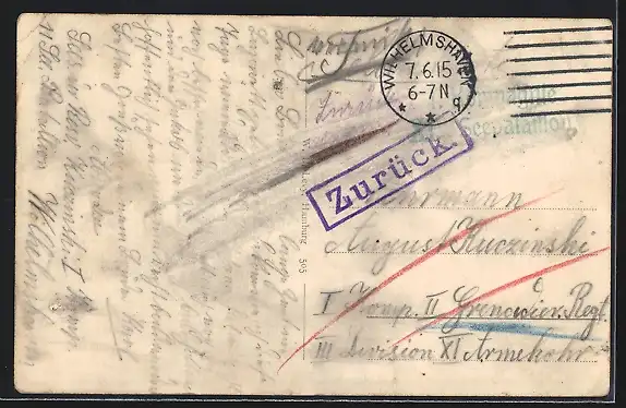Personenbezogene Daten auf der Rückseite der Karte wurden durch blauen Textmarker unkenntlich gemacht. Die blauen Stellen sind auf die Vorderseite durchgeweicht und wirken sich negativ auf das Postkartenfoto aus
