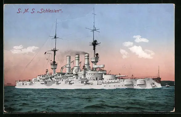 AK Kriegsschiff SMS Schlesien im Abendrot