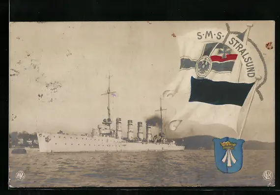 AK Kriegsschiff S.M.S. Stralsund vor der Ausfahrt