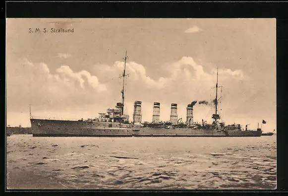 AK Kriegsschiff SMS Stralsund während der Hafeneinfahrt
