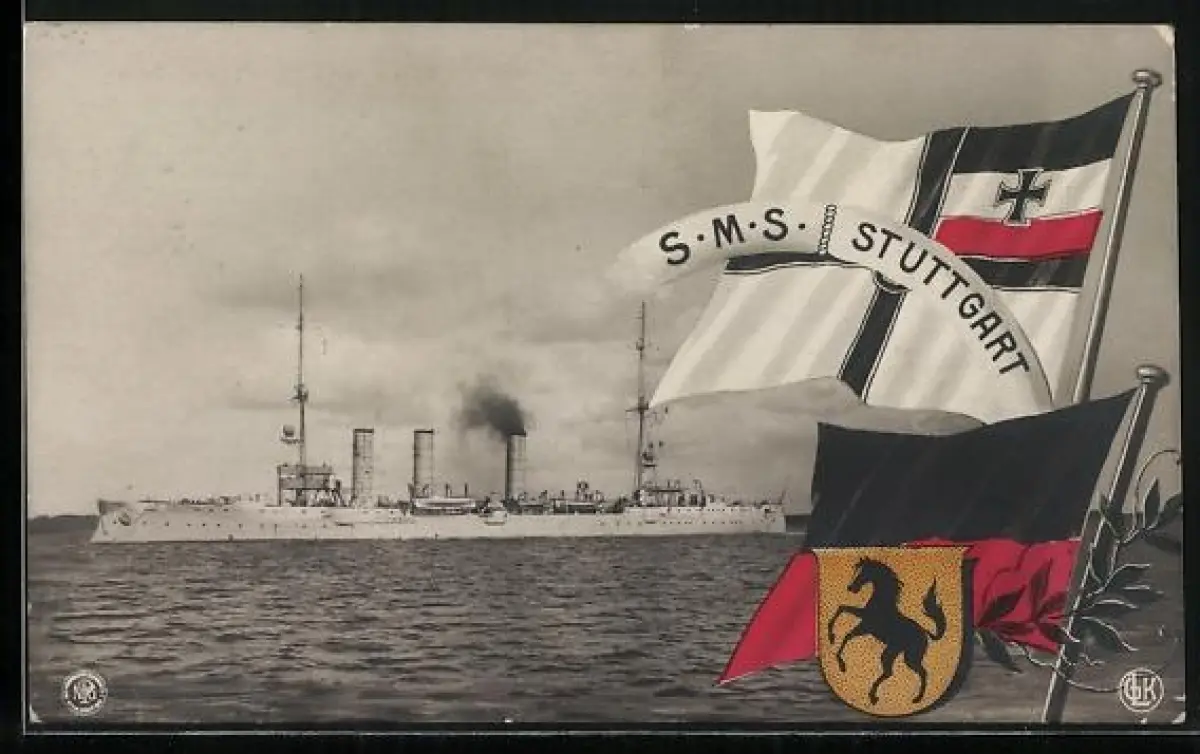 AK Kriegsschiff S.M.S. Stuttgart, Reichskriegsflagge und Wappen