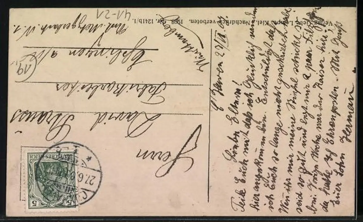Personenbezogene Daten auf der Rückseite der Karte wurden durch blauen Textmarker unkenntlich gemacht. Die blauen Stellen sind auf die Vorderseite durchgeweicht und wirken sich negativ auf das Postkartenfoto aus
