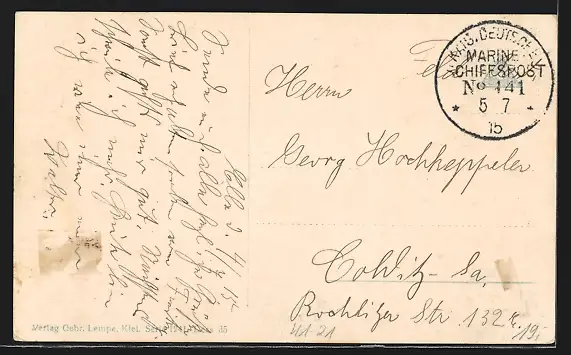 Personenbezogene Daten auf der Rückseite der Karte wurden durch blauen Textmarker unkenntlich gemacht. Die blauen Stellen sind auf die Vorderseite durchgeweicht und wirken sich negativ auf das Postkartenfoto aus