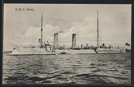 AK Kriegsschiff SMS Thetis vor der Küste, Ostasiengeschwader