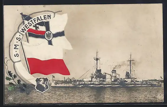 AK Kriegsschiff S.M.S. Westfalen, Wappen und Reichskriegsflagge