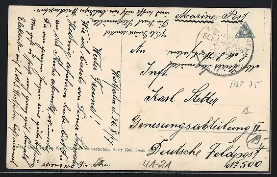 Personenbezogene Daten auf der Rückseite der Karte wurden durch blauen Textmarker unkenntlich gemacht. Die blauen Stellen sind auf die Vorderseite durchgeweicht und wirken sich negativ auf das Postkartenfoto aus