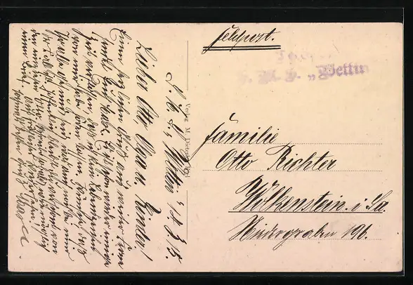 Personenbezogene Daten auf der Rückseite der Karte wurden durch blauen Textmarker unkenntlich gemacht. Die blauen Stellen sind auf die Vorderseite durchgeweicht und wirken sich negativ auf das Postkartenfoto aus