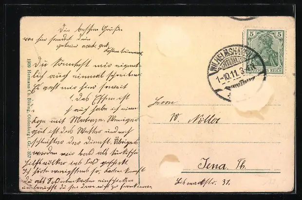 gelaufen 1911, rückseitig Oberflächenschaden, guter Zustand