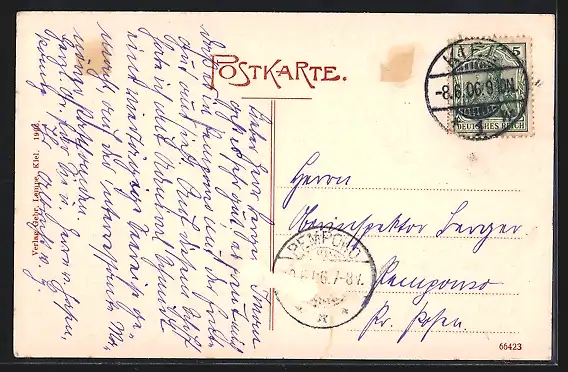 alte Ansichtskarte, gelaufen 1906, rückseitig Oberflächenschaden, rückseitig Klebe- und Papierreste, Abriebspur li. oben
