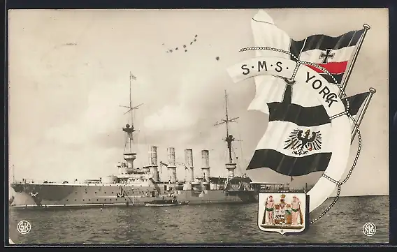 AK Kriegsschiff S.M.S. Yorck neben einem Versorgungsbeiboot auf dem Wasser, Reichskriegsflagge